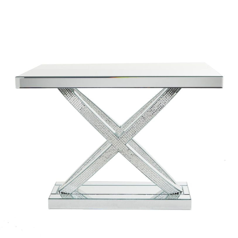 SILVER GLASS GEOMETRIC X-SHAPED MIRRORED CONSOLE TABLE WITH CRYSTAL EMBELLISHMENTS